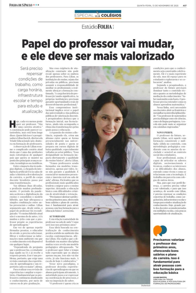 Na última semana, dia 13 de novembro, uma entrevista que fizeram comigo e foi publicada pela Folha de São Paulo gerou muitos compartilhamentos e mensagens, principalmente por educadoras e educadores, no Instagram. A temática era: o Papel do professor vai mudar, e ele precisa ser mais valorizado (ver imagem da matéria, no final deste texto). Refletindo sobre essas mensagens recebidas e sobre as ações em que tenho me envolvido nos últimos anos, resolvi apresentar algumas reflexões sobre o contexto de valorização docente e, principalmente, trazer exemplos de iniciativas.